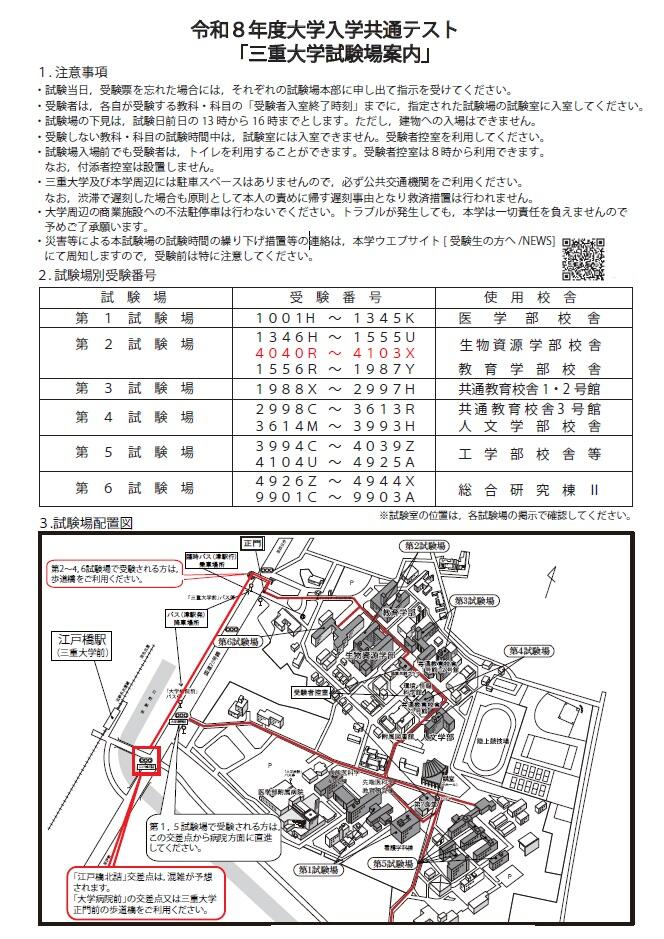 2.令和8年度大学入学共通テスト三重大学試験場案内の注意事項を必ずご確認ください。