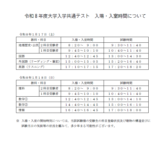 4.試験室への入室開始時刻は,以下のとおりです。なお,受験者控室は8時から利用できます。